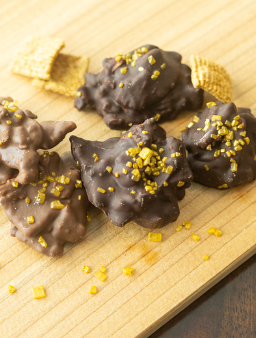 Golden Grahams cereal mixed into milk or dark chocolate, finished with a shimmering gold dusting. Think s’mores meets sparkle—crunchy, chocolatey, and absolutely golden.